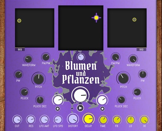 While complex in texture, at its core Blumen und Pflanzen is quite simple: two identical oscillators are set in an FM feedback loop, each pulsating with its own speed and envelope. Each oscillator can FM or PM modulate each other, with an intuitive XY control pad creating powerful and expressive opportunities to make everything from smooth sine tones to brutal noise.