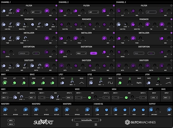 While Subvert’s primary focus is on Distortion, it features four additional effects that can be configured in various ways across its three channels. Driving its core are 2 envelope followers and 4 LFOs with various wave shapes and optional tempo sync, which can have their output inverted or combined using up to 4 modulation mixers. The final output of the plugin can be sculpted with the global 3-band EQ.