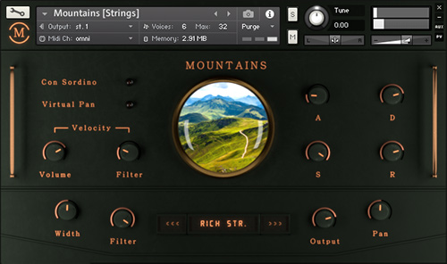 The new interface gives you now full ADSR control and has a master section where you can set Stereo width, Filter (LP) cutoff, Output gain and Panorama position. Each of the three patches has also some individual controls like a con sordino button for the strings or tape saturation settings for the pads.
