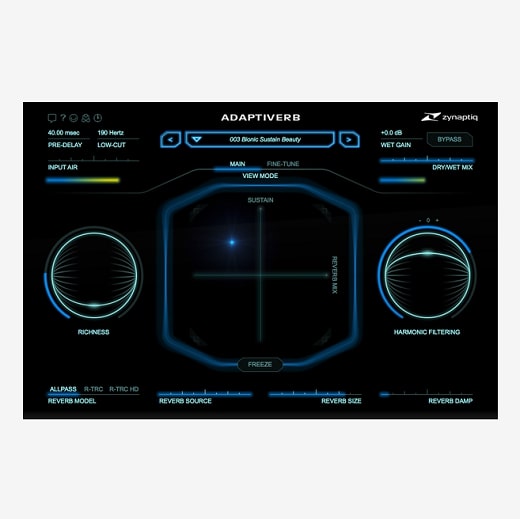 Powered by ray tracing, source separation, and advances in artificial intelligence, ADAPTIVERB automatically adapts to the input audio like a chameleon, blending with your sounds perfectly, and conforming its reverb tail to the tonality of the input or a user defined set of notes.
